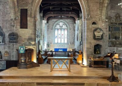 St Mary’s Church the “jewel in the crown of Ross,” with its well-proportioned spire (the highest in Herefordshire) sits proudly above the town. The building dates mainly from the late 13th and 14th centuries though two sensitive restorations in the 19th century and a complete reordering of the nave in recent years are responsible for the look and feel of the building today.