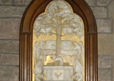 George Bodley was a friend of William Morris, one of the chief exponents of the Arts and Crafts movement, and himself was a known strong supporter of this style. The paintings behind the altar and the unusual plaster cast on the wall just inside the front door bear witness to the influences of Arts and Crafts. The plaster cast was modified several years ago and is now a memorial to the persons of the village who gave their lives in the First World War.