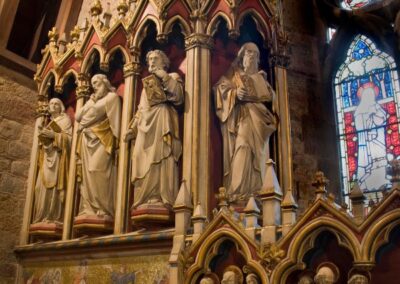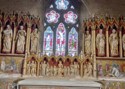 In such an idyllic setting you might expect to find an ancient church, but the current church (dedication unknown) is largely the work of Victorian architect Thomas Blashill of London, begun in 1875. Blashill’s design is a lovely example of ‘High Church’, or Anglo-Catholic style, incorporating pieces of an earlier medieval church on the site, including several 13th century windows and a piscina of similar age. – Britain Express Background.