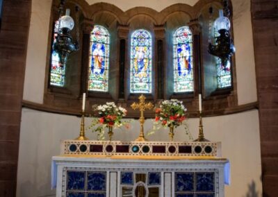 Inside there are wooden carved choir stall figures, marble columns and altar with lapis lazuli with the central cross made of tiger-eye, and a fine Burne-Jones window at the apex of the cluster of windows on the west wall. Over the altar there is a wonderful mosaic of Christ in Glory and the hanging lamps and are lit at Christmas.