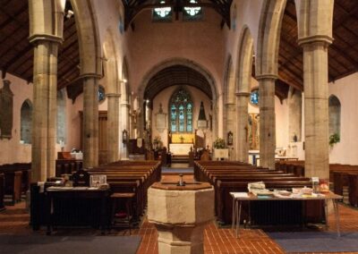 The Chancel was described by John Leonard as the ‘artistic treasure house of St. Michaels’ and was restored, along with other parts of the Church fabric, in 1866-68 by the renowned G.F.Bodley. The east windows are 14th century stained glass and were said to have been removed and buried by the villagers on the outbreak of WW11, to prevent their being looted in the case of an invasion.